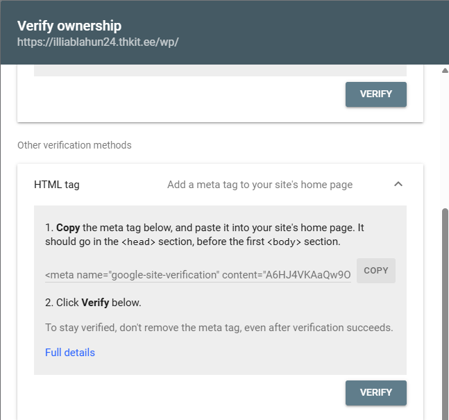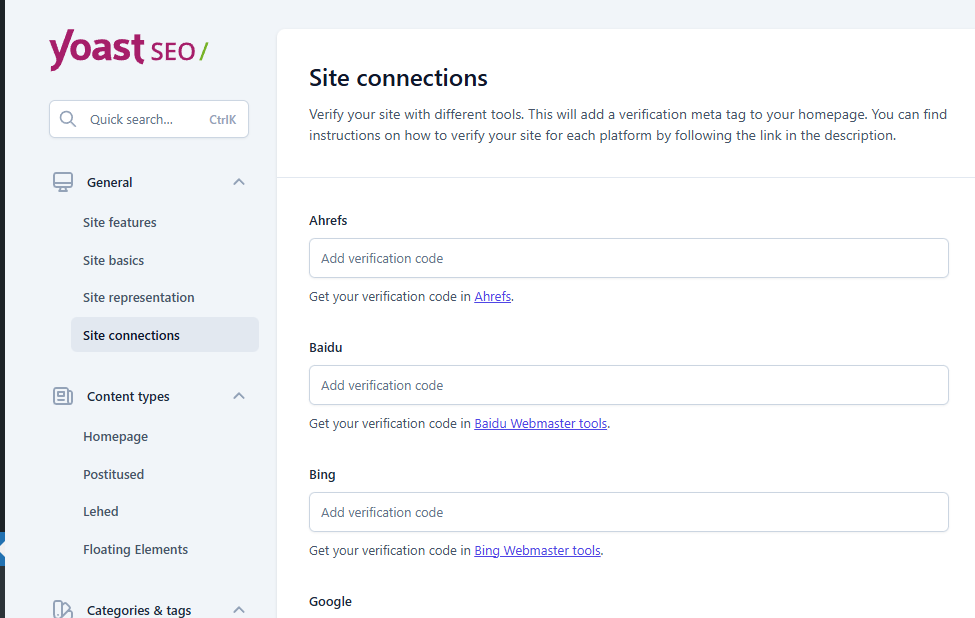 2. SEO plugini seadistused, kasutame verifitseerimiseks Google Search Konsooli